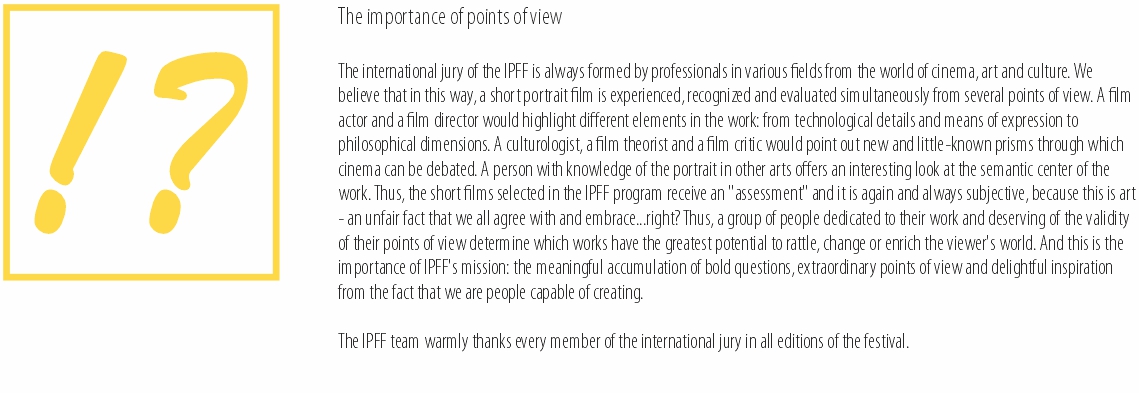 We dream and work hard to develop and build the IPFF. We believe that in this way we will give more value and meaning to the people for whom portrait cinema and short forms bring a strong charge - creators, artists, viewers, researchers.