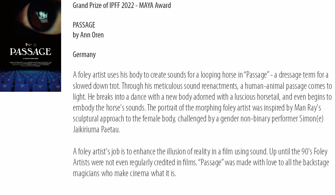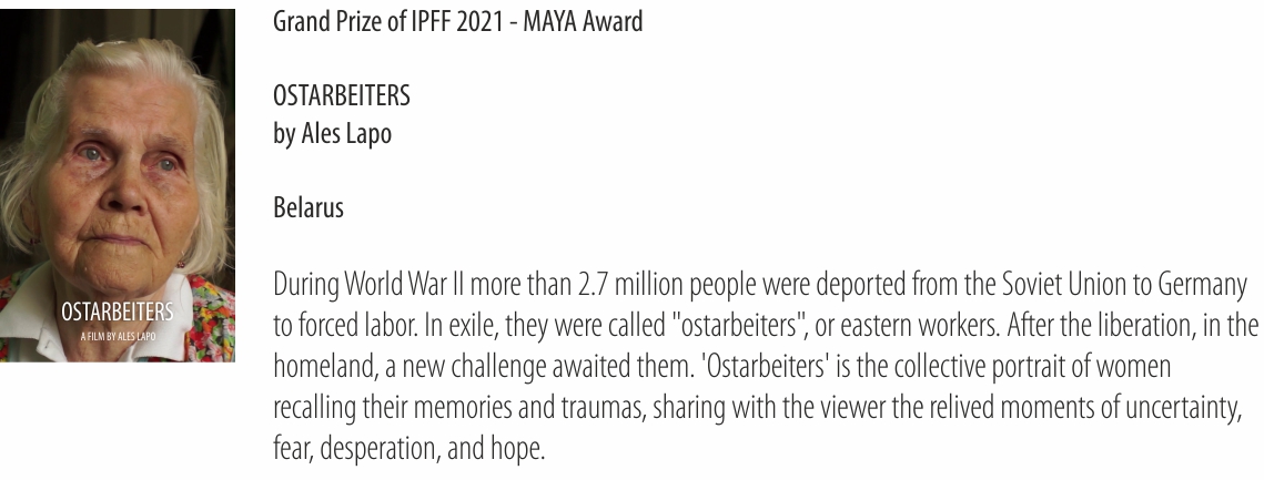 Seven films were awarded for their unforgettable messages, impressive audio-visual language and sensual charge. For the most beautiful creation in each category (Film Portrait, Film Self-Portrait, Collective Portrait, Alternative Portrait, Portrait in Motion, Film-Dedication and the Grand Prize of the IPFF - the MAYA Award), the artists received a handmade plastic statuette of copper and marble. Thanks to the imagination and hands of Izabela Manolova and Martin Christoph.