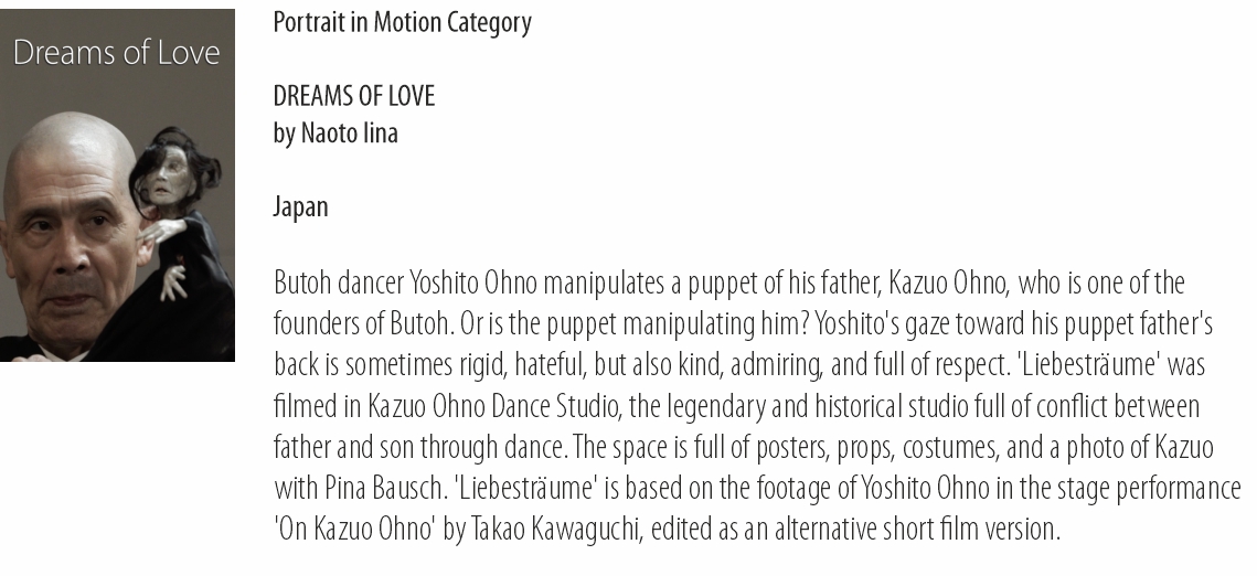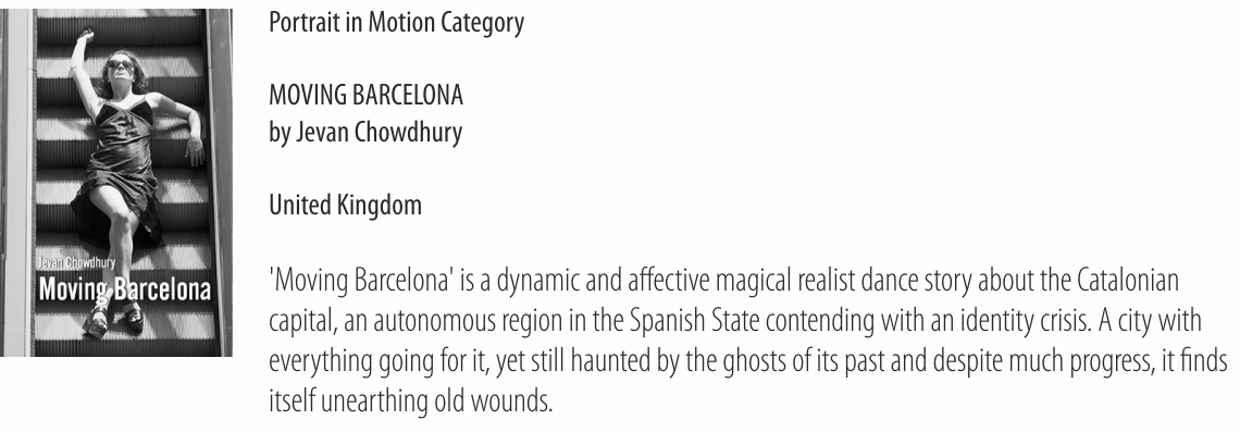 A portrait in a specific form - that of the intersection of cinema and dance, the exciting art and practice known as screendance. The portrait is obligatory but undefined. It can be of a person, of the self, of a collective or an alternative portrait. The condition here is that the means of expression within the work is through the symbiosis of dance and film, or screendance.